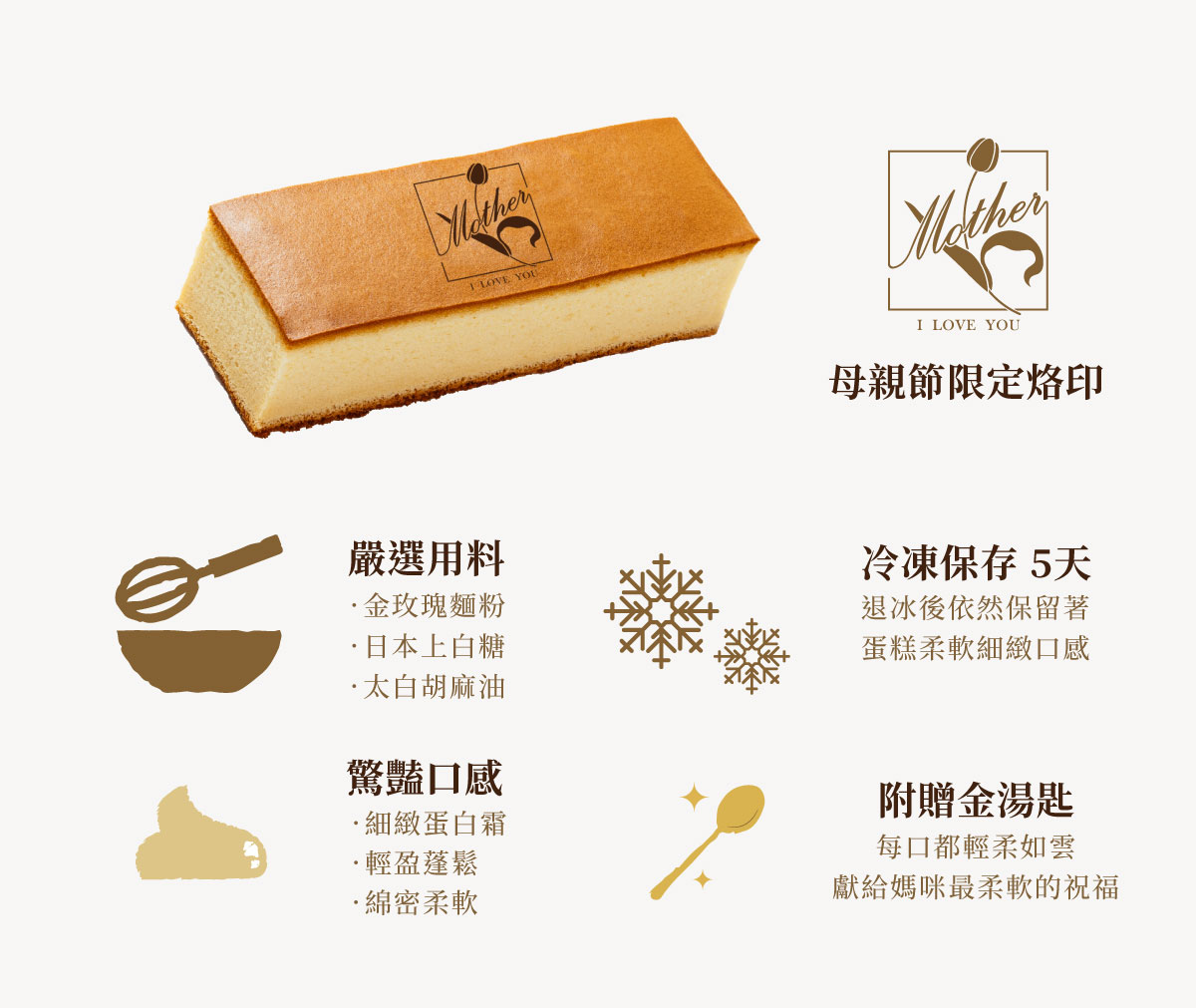 每條雪芙蛋糕皆附贈金湯匙,象徵「含金湯匙出生」的幸福寓意,不只是蛋糕,更是一份充滿祝福與心意的母親節禮物。